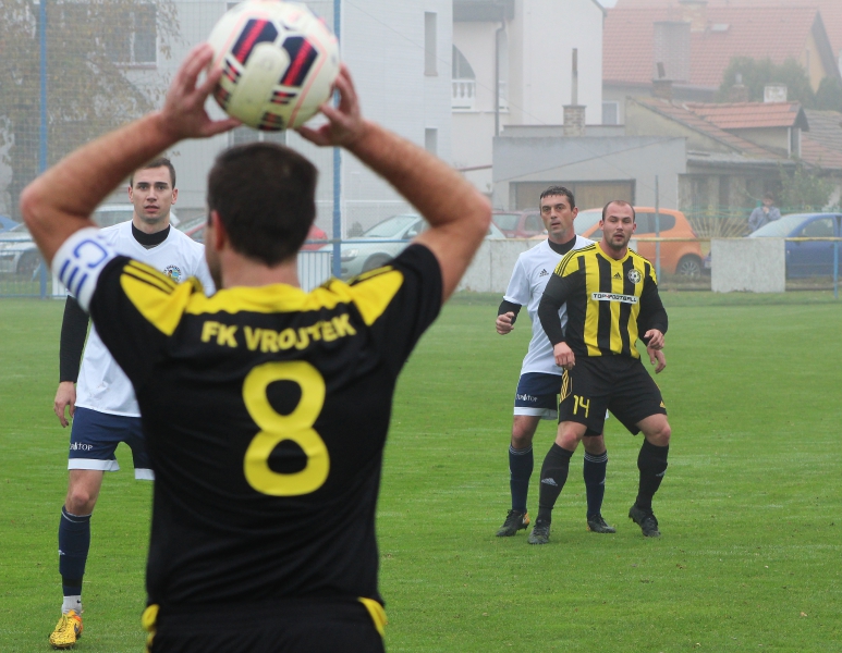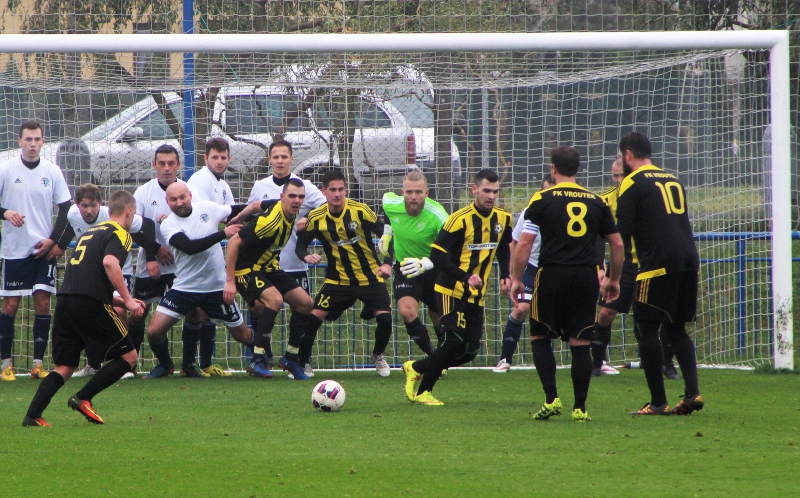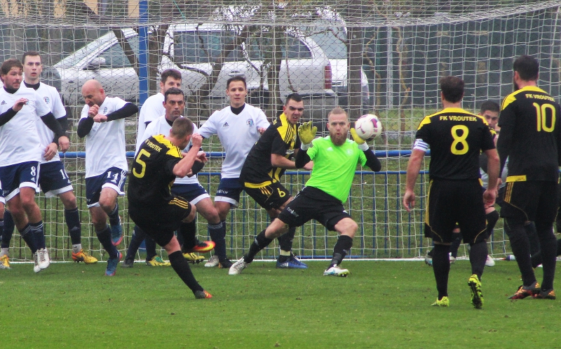 Hned od úvodu zatlačili domácí fotbalisté soupeře před jeho bránu. A tvořili si šance. Tu asi největší neproměnil Papežík, kterému na malé vápno naservíroval míč Maliňák. Papežík ale odkrytou bránu netrefil. Gólem zaváněla také pěkná narážečka Reha a Maliňáka, který střílel jen do nohy brankáře Bezděka. V další šanci domácích zabránil ve skórování Němcovi na poslední chvíli Heinc. Centr Plachého na přední tyč zakončoval Reh hlavou nad. Okřídlené nedáš, dostaneš se potvrdilo v závěru první půle. Vroutečtí skórovali z ojedinělé šance – přesně k tyči se trefil Chroust.